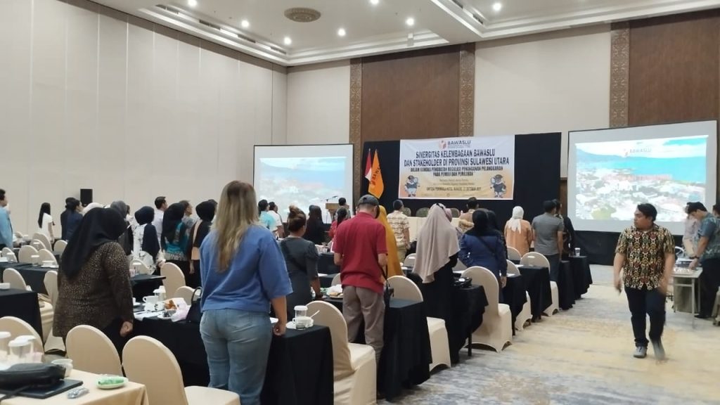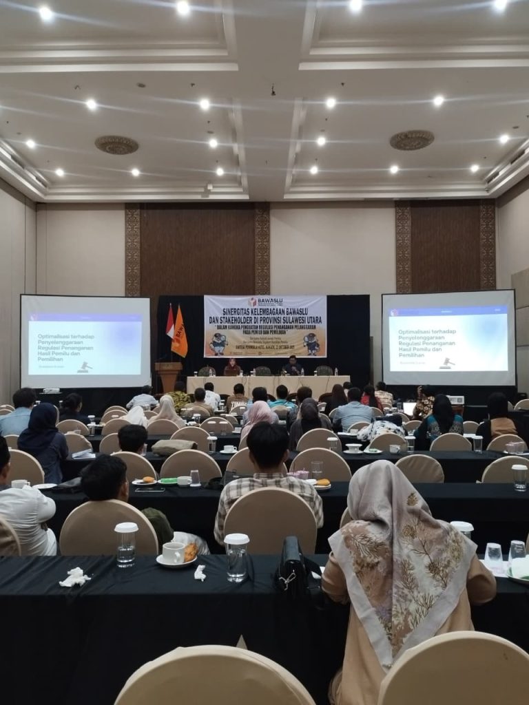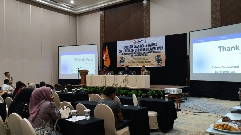 Manado, 23 Oktober 2025 — Dalam kegiatan bertema “Sinergitas Kelembagaan Bawaslu dan Stakeholder di Provinsi Sulawesi Utara dalam Rangka Penguatan Regulasi Penanganan Pelanggaran pada Pemilu dan Pemilihan”, Badan Pengawas Pemilihan Umum (Bawaslu) Provinsi Sulawesi Utara. Dalam kegiatan ini Bawaslu Sulawesi Utara menghadirkan dua narasumber penting yaitu Prof. Dr. Rosdalina Bukido, M.Hum., CPM., selaku akademisi IAIN Manado serta pegiat Pemilu Abdullah, S.TP.