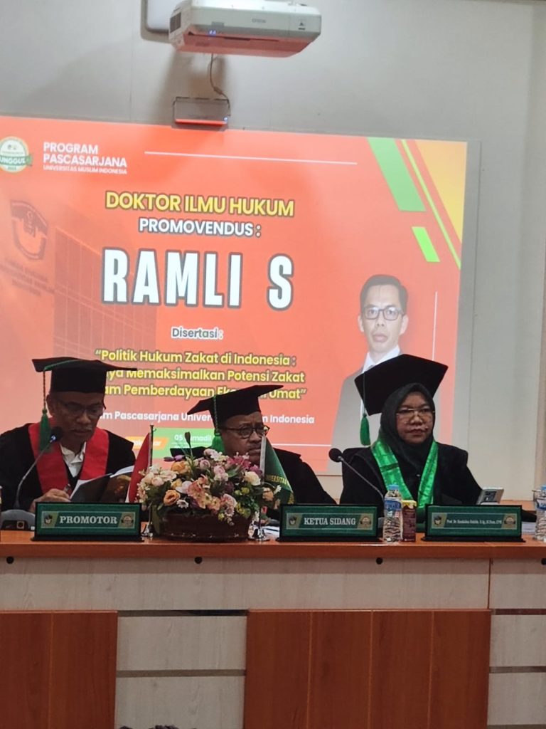 Promovendus dalam ujian terbuka tersebut adalah Ramli Semawwi (Nomor Induk Mahasiswa: 0021DIH242019) dari Program Studi Ilmu Hukum, Konsentrasi Hukum Tata Negara, yang mempertahankan disertasi berjudul “Politik Hukum Zakat di Indonesia: Upaya Memaksimalkan Potensi Zakat dalam Pemberdayaan Ekonomi Umat.”