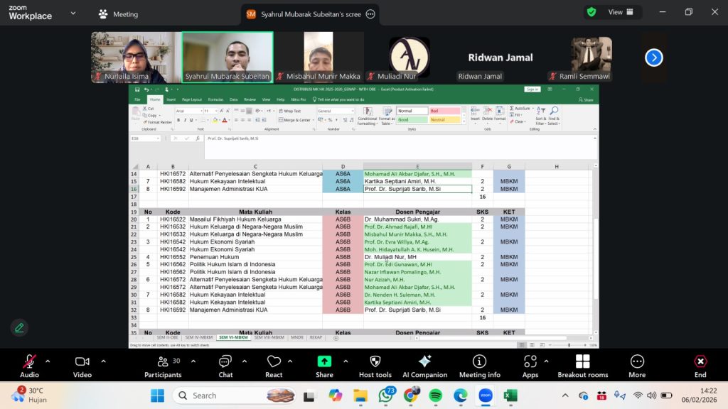 Fakultas Syariah IAIN Manado, 6 Februari 2026 – Guna mempersiapkan perkuliahan Semester Genap Tahun Akademik 2025/2026, Fakultas Syariah IAIN Manado menyelenggarakan Rapat Distribusi Mata Kuliah (MK) secara virtual melalui Zoom Meeting, Jumat (6/2/2026). Rapat yang dimulai pukul 13.30 WITA ini dihadiri oleh segenap dosen undangan sesuai dengan Surat Undangan Nomor B-89/In.25/F.I/PP.00.9/2/2026.
