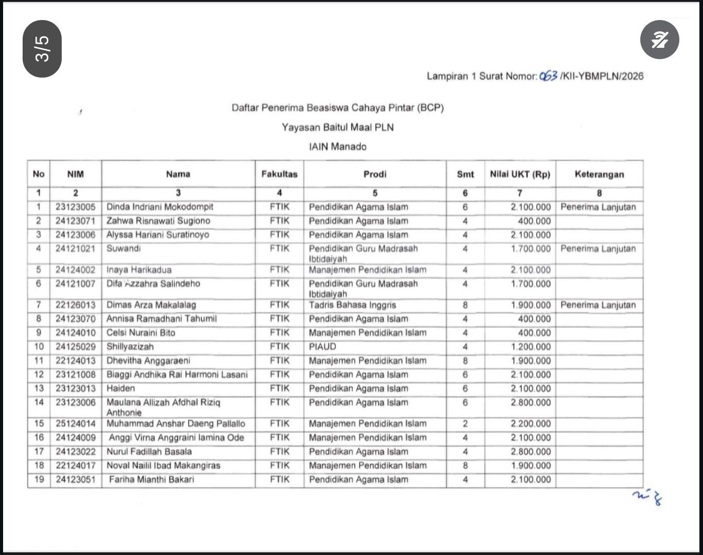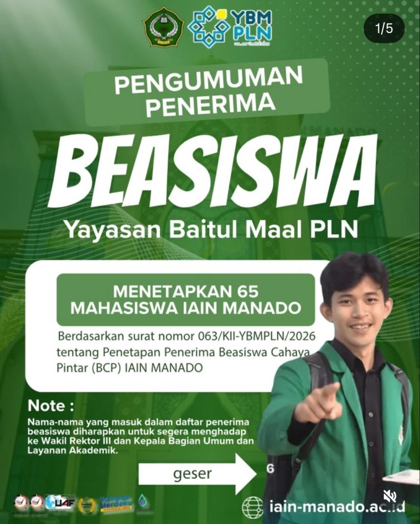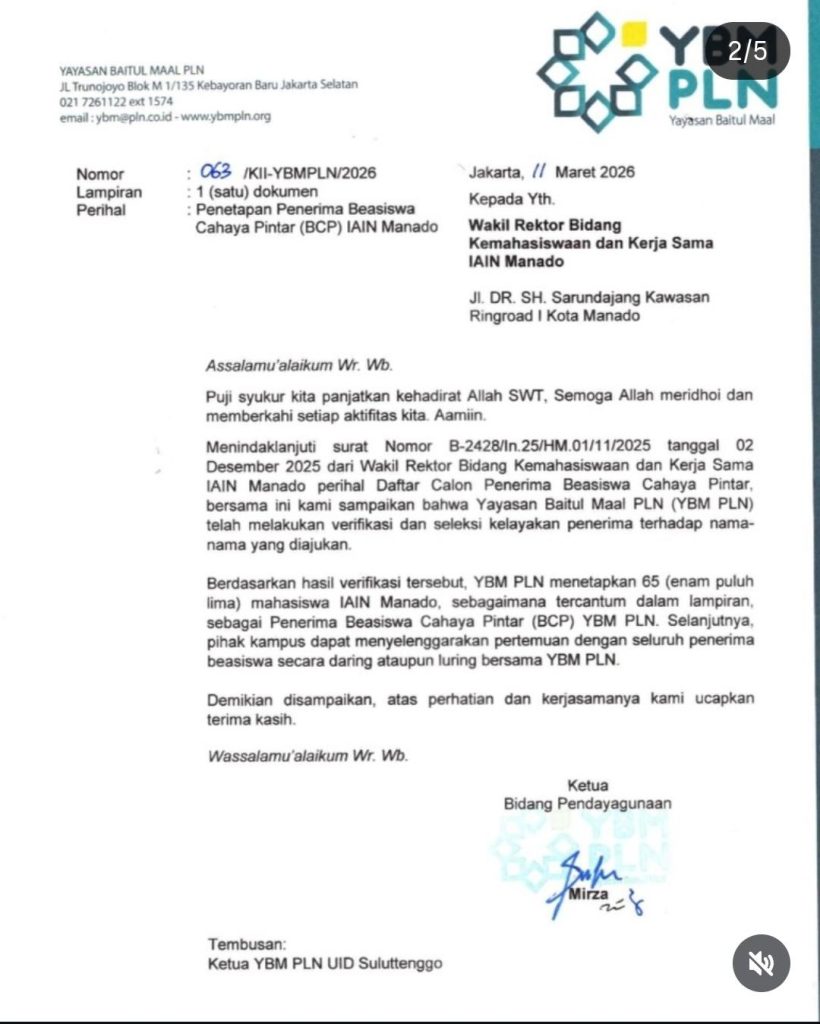 Fakultas Syariah IAIN Manado — Kabar membanggakan datang dari Fakultas Syariah IAIN Manado. Sejumlah mahasiswa berhasil meraih Beasiswa Yayasan Baitul Maal (YBM) PLN Tahun 2025 sebagai bentuk apresiasi atas prestasi akademik dan komitmen sosial yang dimiliki.